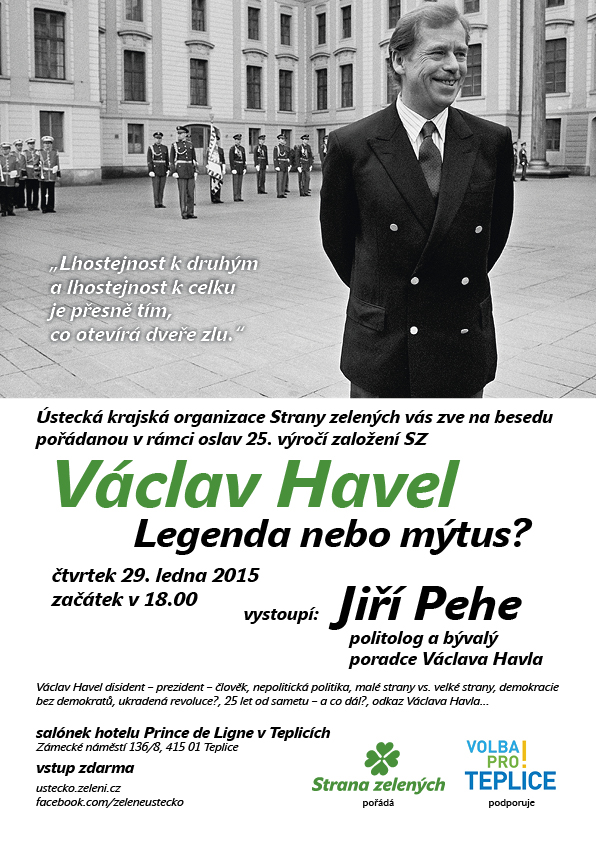 Ústecká krajská organizace Strany zelených vás zve na besedu pořádanou v rámci oslav 25. výročí založení SZ. O osobnosti Václava Havla přijede diskutovat politilog a bývalý ředitel Politického odboru Kanceláře prezidenta republiky Václava Havla Jiří Pehe. Vstup na akci je zdarma.